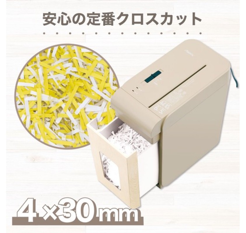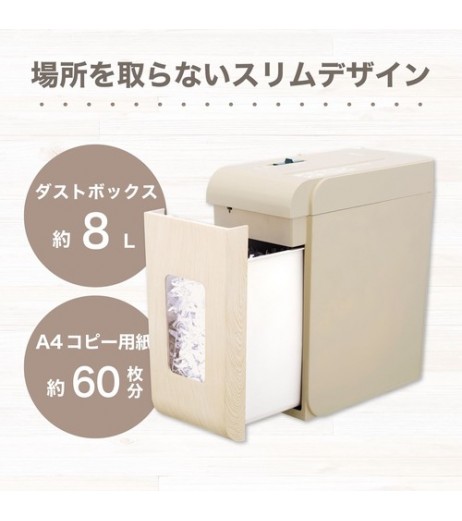 - ■場所を取らないスリムボディ横幅が約17cmと超スリムなコンパクトボディ!ちょっとした隙間に置けて見た目もスペースもスッキリ◎■安心の超静音設計約48dbの超静音タイプなので静かなオフィスや夜間でも音を気にせずご使用いただけます。■10分間の連続使用可能コンパクトボディなのに連続使用10分!オフィスでもご家庭でも溜まった書類を一気に細断できます。ネットショッピングからでる送り状も細断できます。■クロスカット細断用紙を4×10mmに細断します。細かすぎない細断サイズでゴミ捨ての際にゴミが飛びづらくキレイ好きの方にもおすすめです。■おしゃれなウッドデザインインテリアに馴染む木目デザインで出しっぱなしにしても目立ちません。もちろんホッチキスの針もそのまま裁断できるので、まとめられた書類も束のまま細断できてとってもラクになります!